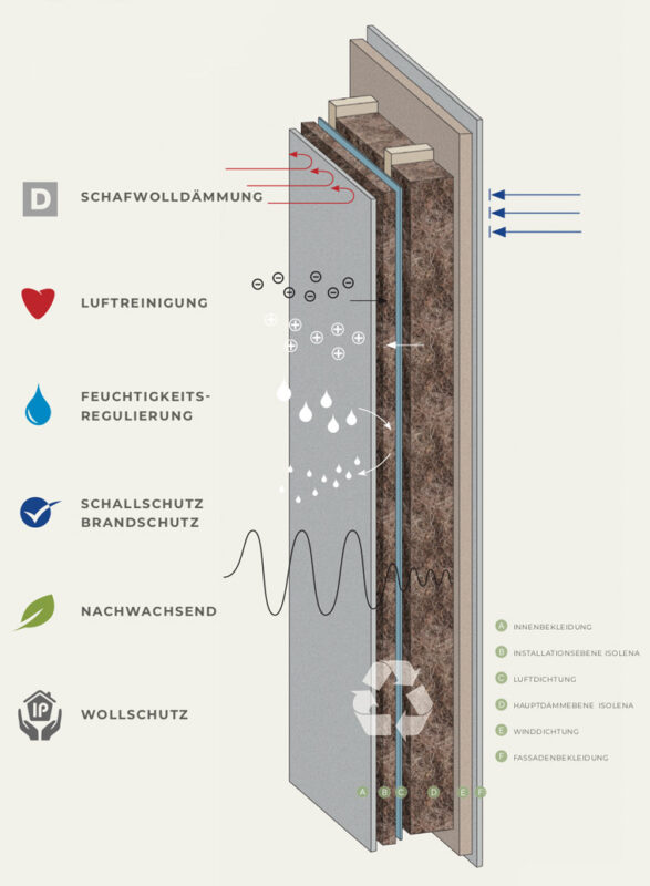 Isolena Schafwolldämmung schützt vor Kondensation und Schimmel und bietet durch Keratin eine hervorragende Geräuschminderung. Die Dämmung ist zudem sicher, da sie einen hohen Flammpunkt besitzt und ohne Brandschutzmittel auskommt, wodurch im Brandfall keine giftigen Gase entweichen.