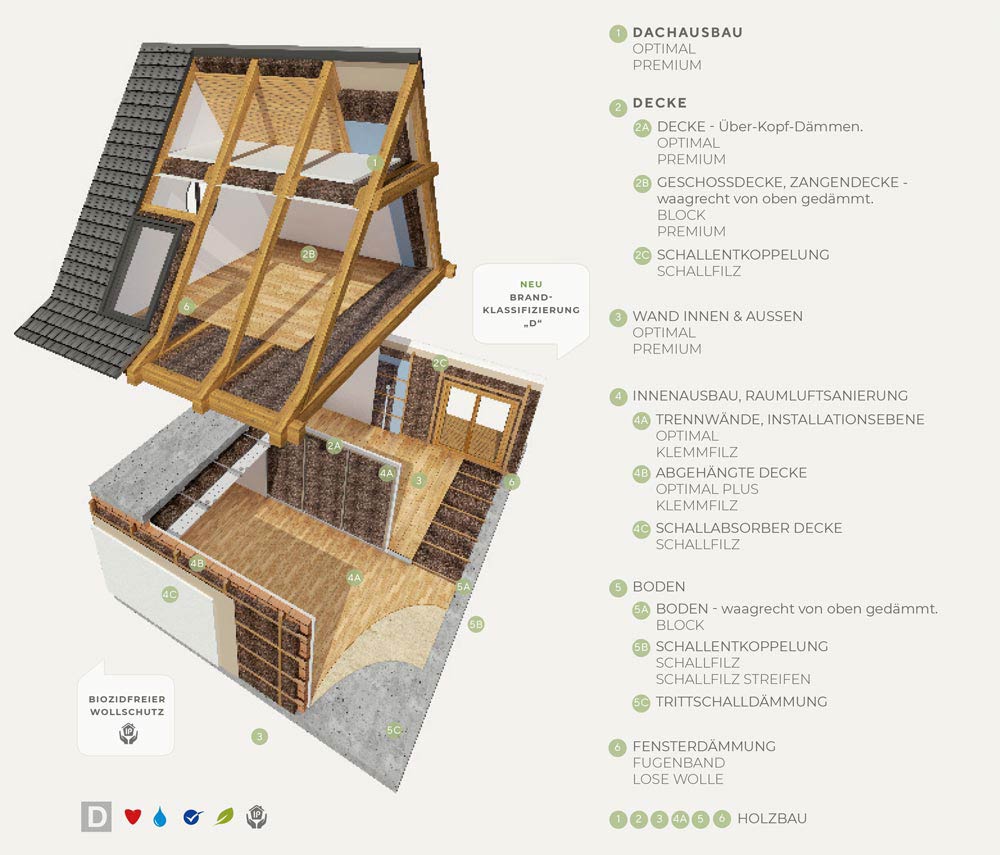 Schafwolle verfügt über exzellente Eigenschaften, wodurch sie bestens geeignet ist für die Dämmung und somit die Isolierung im Haus. Nutzen Sie Produkte, die durchdacht darauf abgestimmt sind, in welchen Bereichen des Hauses sowie in welcher Funktion sie eingesetzt werden können: in der Wand, im Dach, in der Decke, in der Fassade, in Fenstern, im Boden, in einer Akustikdecke und an vielen weiteren Stellen eines Gebäudes.
